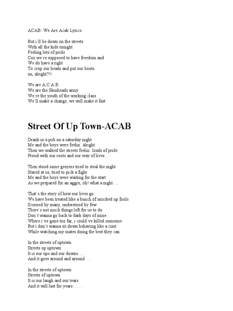 There are 60 lyrics related to Back On The Street Acab. Make one false move Ill take you down. We are the skinhead army.